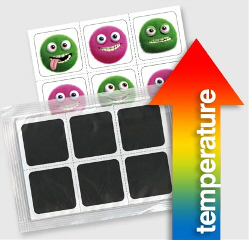 Another possibility of print refinement are the thermo-active paints used for production of our promotional materials. The printed emblems change their colors while exposition to a definite temperature – the color may change, appear or disappear and the process itself is reversible (after reaching a certain temperature appears the thermo-active image or appears a classic-print-layout which was “hidden” so far under the thermo-active cover print).